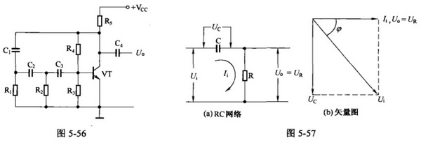 a.RC移相振蕩器電路如圖5-56所示。C1~C3、R1~R3組成移相網絡。R4是基極偏置電阻,R5是集電極電阻。C4是輸出耦合電容。由于晶體管VT的集電極輸出電壓與集電極輸入電壓互為反相(兩者相差180度),因此必須將集電極輸出電壓移相180度(即在反相一次)后送至基極,才能是電路起振。