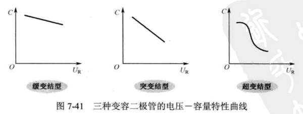 變?nèi)荻䴓O管按照PN結的結構和結面附近雜質(zhì)的分布情況不同,可以分成緩變結、突變結和超變結三種類型,如圖7-41所示是三種變?nèi)荻䴓O管的電壓—容量特性曲線,圖中X軸方向變?yōu)樽內(nèi)荻䴓O管上的反向偏置電壓,Y軸方向為結電容。