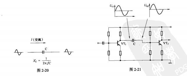 (1)信號耦合。電容器可以將前級電路的交流信號耦合至后級電路。圖2-21所示為兩級音頻放大電路,晶體管VT1集電極輸出的交流信號通過電容C傳輸到VT2基極,而VT1集電極的直流電位則不會影響到VT2基極,VT1與VT2可以有各自適當的直流工作點,這就是電容器的耦合作用。