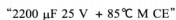 該電容標識為。其中"2200uF"表示電容量大。"25V"表示電容的額定工作電壓;"+85度"表示電容器正常工作的溫度范圍;"M"表示允許偏差為±20%;"C"表示電容;"E"表示其他材料電解電容。所以該電容標識為:其他材料電解電容,大小為2200uF,正常工作溫度不超過+85度。由于電容器直標法采用的是簡略方式,因此只標識出重要的信息,有些則被省略。