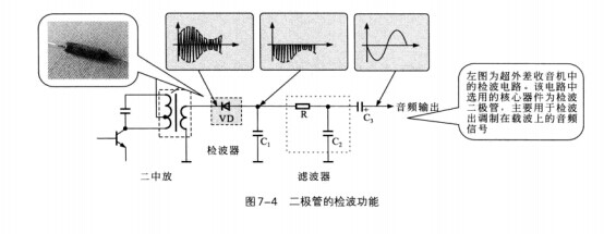 這是由二極管構成的超外差收音機檢波電路,在該電路中,VD為檢波二極管。第二中放輸出的調幅波加到二極管VD負極,由于二極管單向導電特性,其負半周調幅波通過二極管,正半周被截止,通過二極管VD后輸出的調幅波只有負半周。負半周的調幅波再由RC濾波器濾除其中的高頻成分,電容C3阻止其中的直流成分,輸出的就是調制在載波上的音頻信號,這個過程稱為檢波。