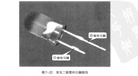 通常情況下,發(fā)光二極管可以通過引腳的長(zhǎng)短來判別極性。如圖7-22所示,引腳相對(duì)較長(zhǎng)的一端為發(fā)光二極管的A極(正極),較短的一端為二極管的K極(負(fù)極)。