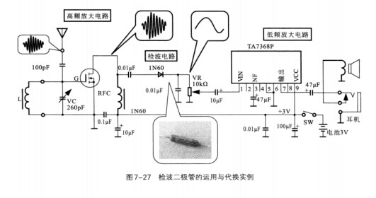 收音機檢波電路中,選用了檢波二極管1N60。高頻放大電路輸出的調幅波加到二極管1N60的正極,由于二極管單向導電特性,其正半周調幅波通過二極管,負半周被截止,通過二極管1N60后輸出的調幅波只有正半周。正半周的調幅波再由濾波器濾除其中的高頻成分,經低頻放大電路后輸出的就是調制在載波上的音頻信號。在代換時盡量選擇同類型同型號的檢波二極管。