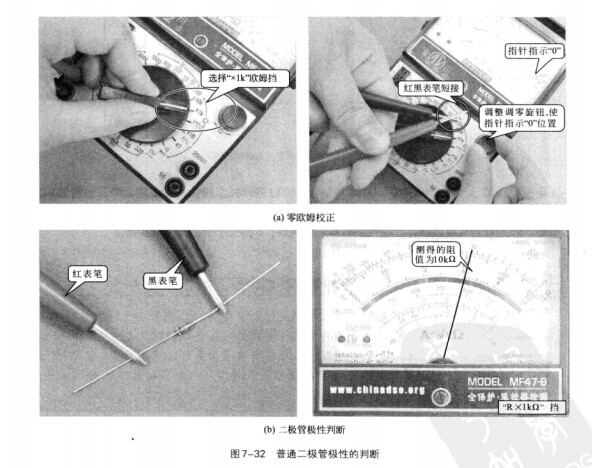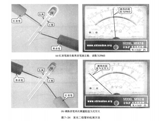 對發光二極管進行檢測,首先選擇萬用表的量程為電阻"R×1K檔",再對指針萬用表進行零歐姆校正。