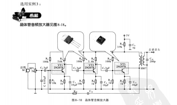 晶體管音頻放大器中,選用的三極管2N2078為美國產的有兩個PN結的晶體三極管,其中VT1和VT2為PNP型晶體三極管,VT3為NPN型晶體三極管。該放大器為一種是小型錄音機的音頻信號放大器,話筒信號經電位器RP1后加到晶體管VT1上,該晶體管是一個共發射極放大器,音頻信號經三極放大后加到變壓器T1的初級線圈上。經變壓器T1將音頻信號送往錄音磁頭,同時,VT3的集電極輸出經R18、C16反饋到VT1的基極,用以改善放大器的頻率特性。在代換時應注意晶體三極管的類型和型號。選擇時選擇同類開型晶體管替換。