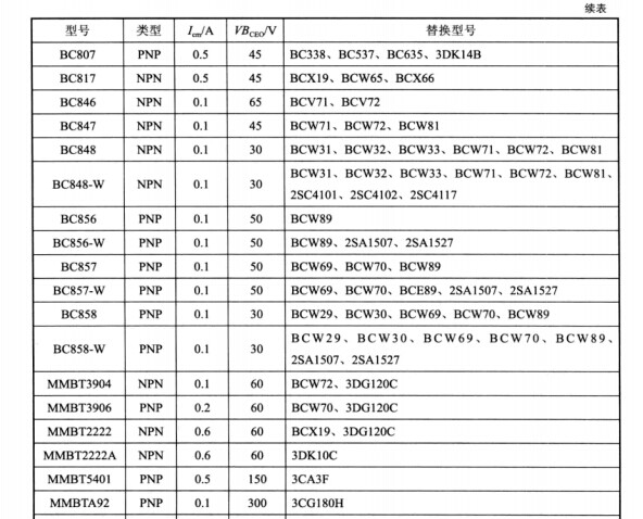 晶體三極管的型號和種類較多,不同種類晶體三極管內部的參數也有所差異,若在代換時,應盡量選用同型號晶體三極管進行代換,有些型號的晶體三極管若代換時無法找到同型號的,也可用其他型號進行代換,常用型號晶體三極管的代換見表8-8所列。